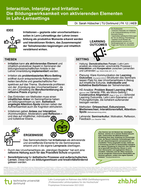 - Irritation als problembasiertes Micro-Setting eröffnet durch entsprechende Reflexionseinheiten berufliche und gesellschaftliche Perspektiven auf das Thema. Studierende profitieren von der "Erprobung des Unvorhersehbaren", da im Lern-Lehrsetting die Berufsorientierung als reflexive Praxis angelegt ist.